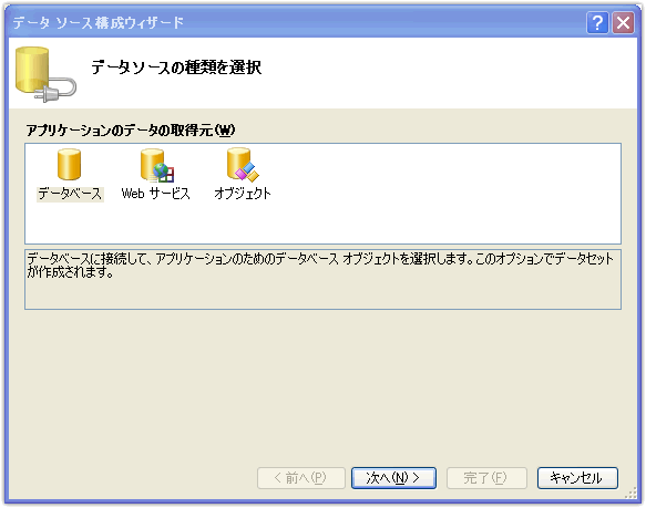 データの取得元は「データベース」を選択して「次へ」をクリックします。