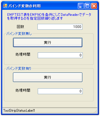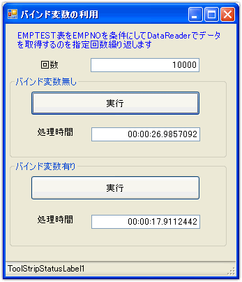EMPTEST表(EMPと同内容で件数100万件)をEMPNOを条件にしてDataReaderでデータを取得するのを指定回数繰り返します。