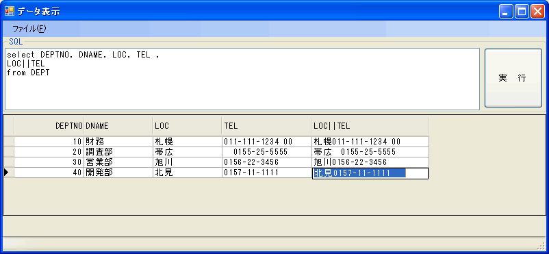 select DEPTNO, DNAME, LOC, TEL , LOC||TEL from DEPT