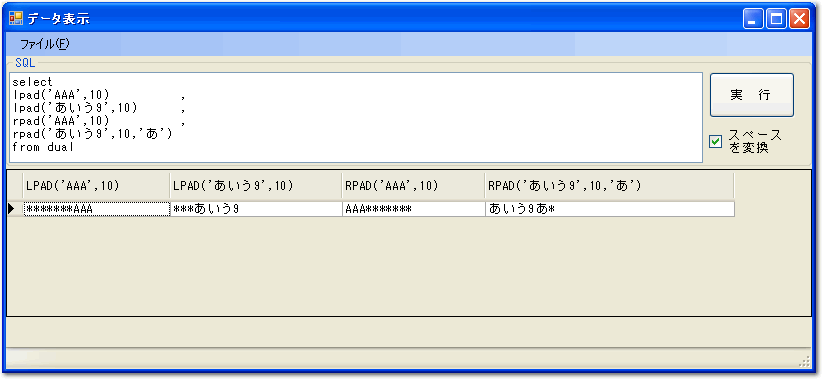 | LPAD ( string , length ,[paddingString] ) | 文字列stringの先頭から指定文字数lengthになるまで左に指定した文字paddingSringを挿入して返す。 |