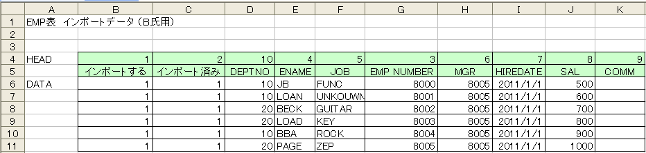 - 列項目を特定する為の文字列や数値をにタイトルの上につけてもらう。(例 「3」はDEPTNO等、ルールを決めておく)(A列のどこか)