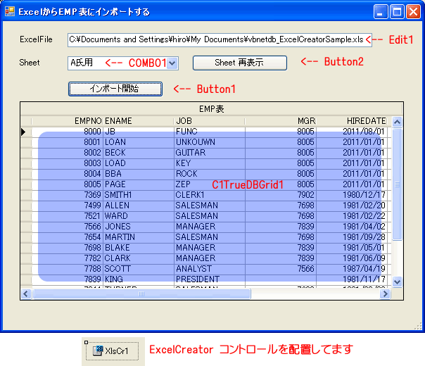 ExcelCreatorを利用し、Excelファイルを読み、OracleのEMP表にインポートします。